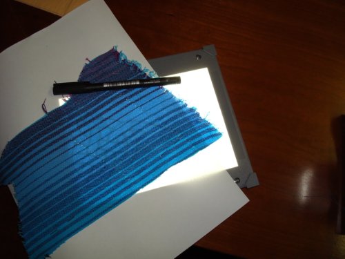 Das Motiv auf den Applikationsstoff übertragen. Ich benutze dazu die Durchlichteinheit meines Scanners. Man kann auch einen Glastisch mit einer starken Lampe oder zur Not einfach das Fenster nehmen. Dafür steckt man den Stoff mit der Vorderseite nach oben auf das Papier