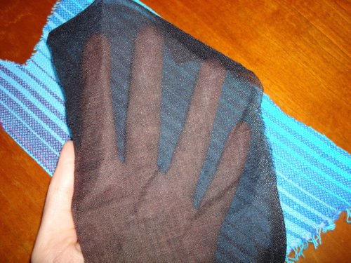 Dann wird die Vlieseline aufgebügelt. Ich habe sehr dünne, netzartige Vlieseline. Das hat den Vorteil, dass man sie später gut schneiden kann. Feste, papierartige Vlieseline ist nicht geeignet.
