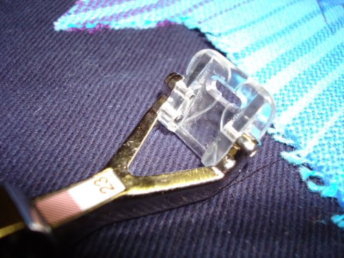 Hier seht ihr meinen Applikationsfuß. Er ist durchsichtig, was sehr wichtig ist, da ihr sonst wirklich nicht seht, wo ihr hinnäht und hat hinten eine Rille für die Raupennähte.