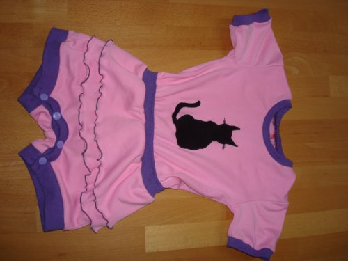 Ich darf ja immer nur für Jungs nähen. Das find ich sehr schade, weil Mädchenkleidung doch meistens viel abwechslungsreicher ist. Deshalb habe ich mir die Freiheit genommen, für die kleine Schwester eines Schülers ebenfalls einen Body nach diesem Schnitt zu nähen – leicht abgeändert quasi als Tütü.