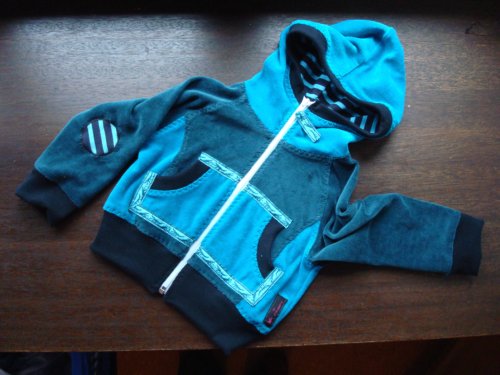 Beim Nähen habe ich dann festgestellt, dass ich ein Stück Krokodilband aus meiner Michas Überraschungstüte habe, dass perfekt zu den Farben passt. Dann musste natürlich auch hinten noch ein Krokodil appliziert werden. Die Kapuze habe ich mit Jersey gefüttert, da ich ungefütterte nicht mag.