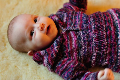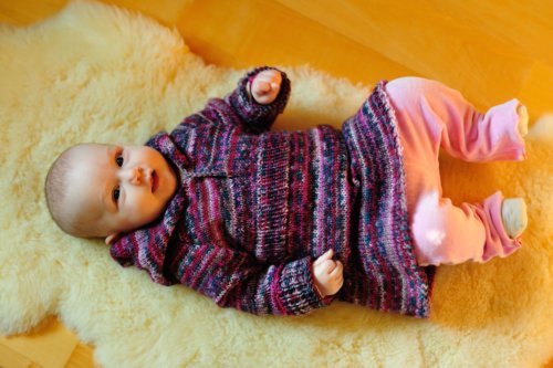 Da ich jetzt in der Stillzeit (ja, hier wird selbstverständlich noch voll gestillt) so gerne Strickjacken anziehe (das ist nicht so ein Gewurschtel) und in der Stadt nix passendes gefunden habe musste Wolle her. Ich habe mir dann 6fädige Regia Sockenwolle (Fjord Berrit) bestellt und eine Raglanjacke gestrickt.