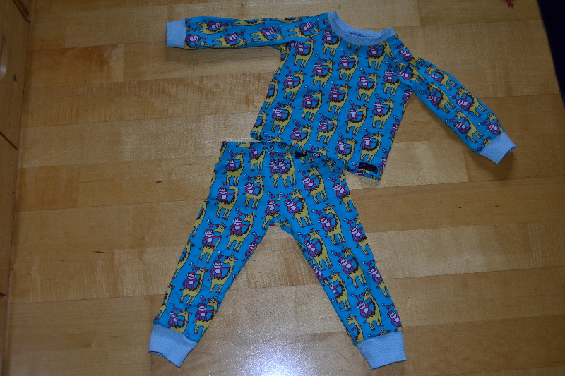 Letztens kam hier eine Überraschungstüte von Michas Stoffecke an, in dem ein Giraffenstoff von Hamburger Liebe zu finden war. Den Stoff hätte ich mir jetzt nicht unbedingt gekauft, da die Farbkombi nicht so ganz meins ist. Mein Sohn ist aber voll drauf abgefahren. Er braucht gerade dringend einen neuen Schlafanzug, da kam der Jersey gerade recht. Als Schnitt habe ich die Schlafi-Kombi aus der Ottobre 6/2009 gewählt. Ein Raglan-Oberteil und eine Hose, die nur aus zwei Stoffteilen besteht und deshalb keine Seitennähte hat.