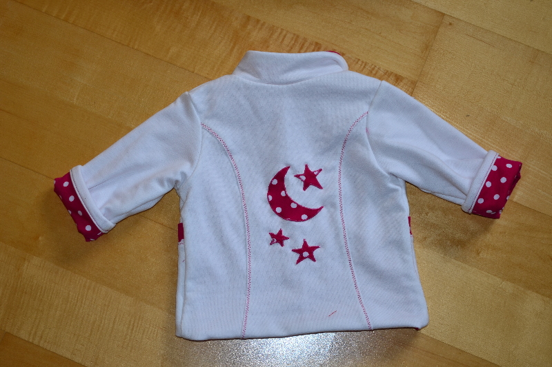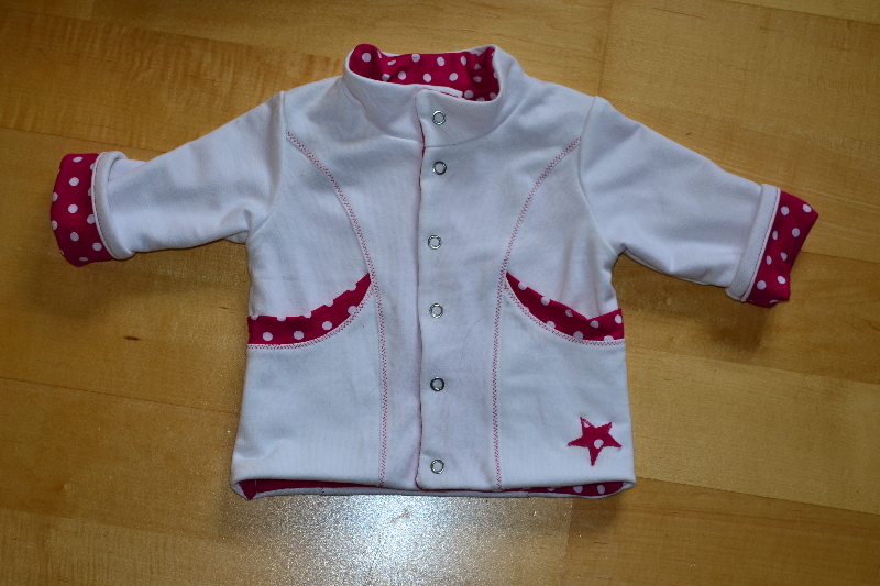 Inzwischen ist die Jacke nicht mehr weiß sondern rosa. Das hatte ich aber eingeplant, die Punkte färben nämlich ganz schön.