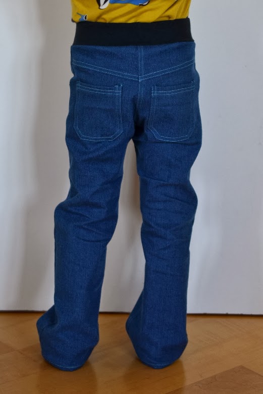 Mein Großer ist im Sommer ein ganzes Stück gewachsen und brauchte dringend wieder passende Hosen. Nachdem er immer noch über Knöpfe und Reißverschluss schimpft und die Hose lieber einfach so hoch und runter zieht, habe ich mir die Arbeit gespart und die Hose mit Bündchen und eingezogenem Gummiband genäht.
