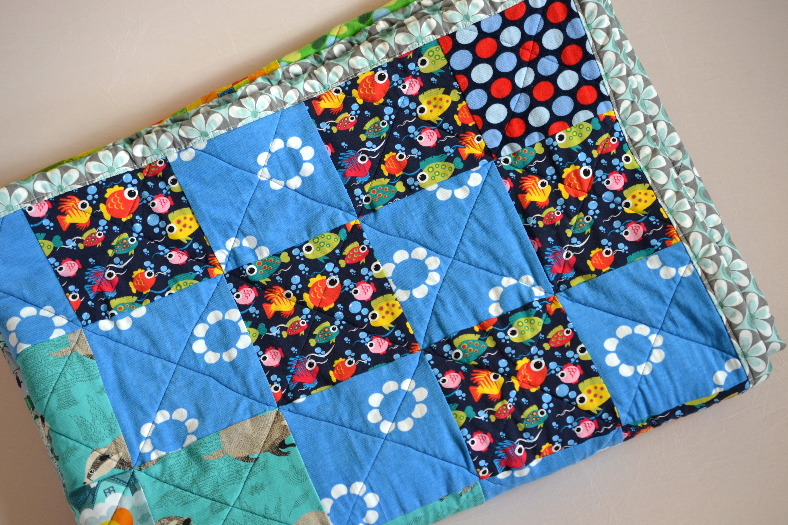 Jedes Quadrat habe ich 15x15cm zugeschnitten. Die Decke ist eigentlich für meinen Sohn. Sie lag aber monatelang unfertig (ohne Binding) auf dem Sofa und ich habe mich immer abends dort eingekuschelt. Irgendwann habe ich sie doch fertig gemacht und dann war ich ganz traurig, weil ich sie dann nicht mehr selbst verwenden durfte.