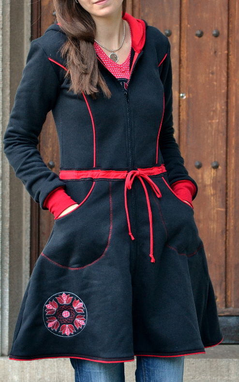Das Kleid habe ich mit einem Mandala bestickt. Besonders mag ich die ganzen Paspelnähte.