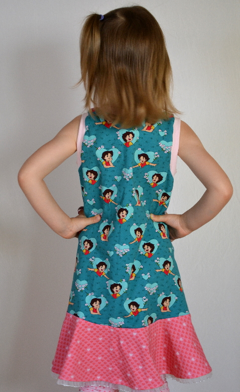 Der Schnitt ist von Klimperklein. Ihr Trägerkleid eignet sich wirklich sehr gut für solche großflächigen Motive. Dazu gibt es eine ganze Menge schöner Kombistoffe.