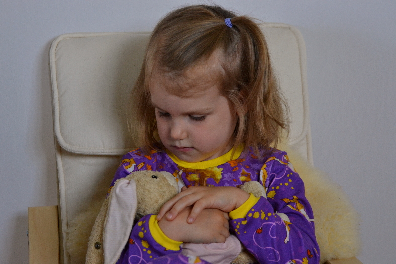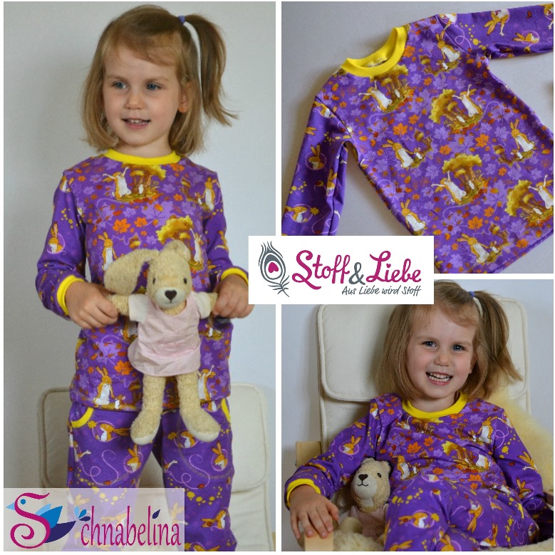 Auch für meine Tochter gab es ein Teil aus der neuen Eigenproduktion von Stoff&Liebe. Dabei habe ich aber etwas gemogelt. Der Stoff für Beine und Arme ist noch aus der ersten Hasen-Kollektion. Ich hatte die Teile damals zugeschnitten. Für das Vorder- und Rückenteil hat der Stoff aber nicht gereicht. Irgendwie konnte ich keinen passenden Kombistoff dafür finden. Bis die Hasen-Kollektion Teil II hier eintrudelte. Beide Stoffe ergänzen sich nämlich prima.