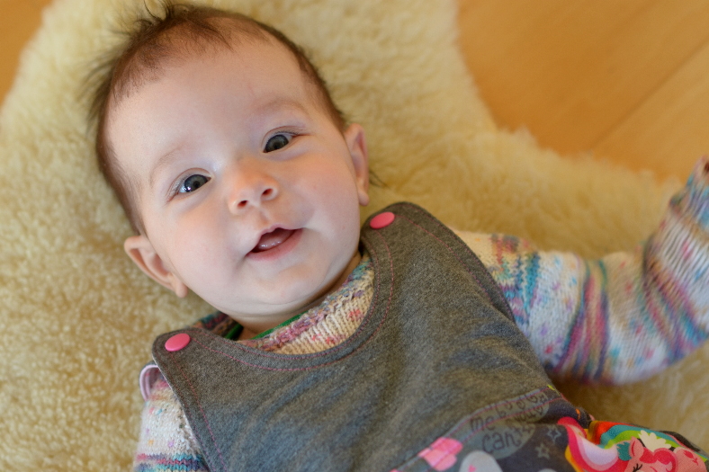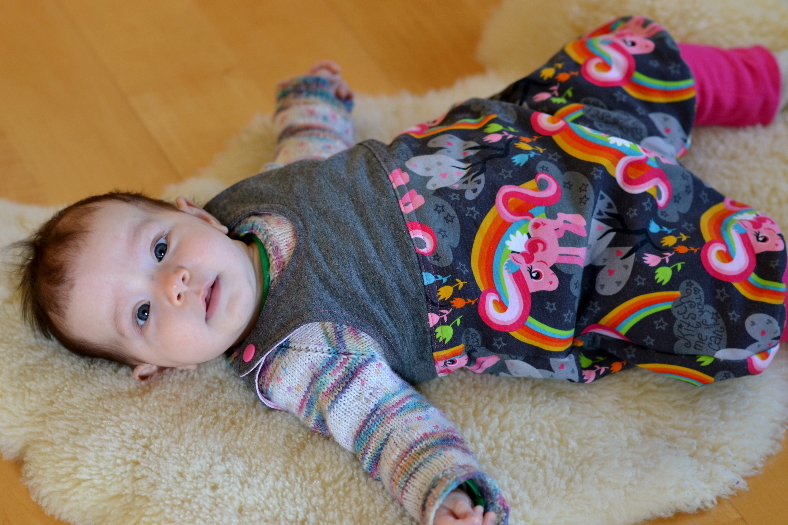 Und wir können sogar inzwischen mit ein paar “Köpfchen hoch” Fotos aufwarten. Das finde ich sind immer noch die aller nettesten Babyfotos (auch wenn man vom Kleidungsstück nicht mehr viel sieht). Jetzt aber zurück zum Thema: Ich brauche wieder Eure Hilfe beim Probenähen. Hier noch mal ein paar Fotos vom Schnitt:
