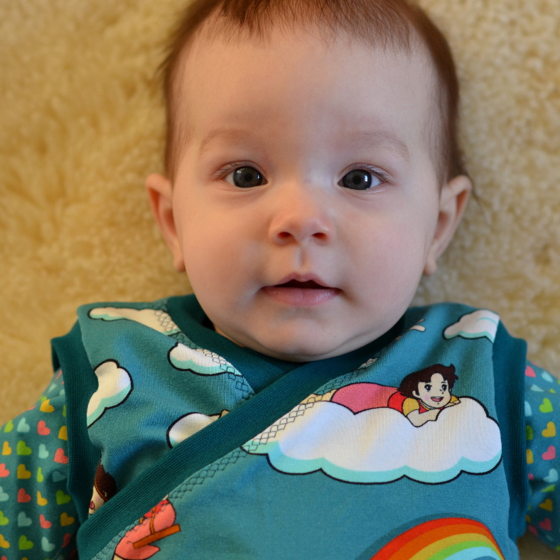 Und wie immer den passenden Regenbogenbody. Ich bin immer wieder erstaunt, wie gut der Schnitt mitwächst. Wir haben hier noch welche in 56, die sie seit der Geburt trägt und langsam werden sie wirklich zu eng aber es geht noch. Dieser hier ist 68 ist irgendwie auch schon tragbar. In 62 ist er gerade perfekt.