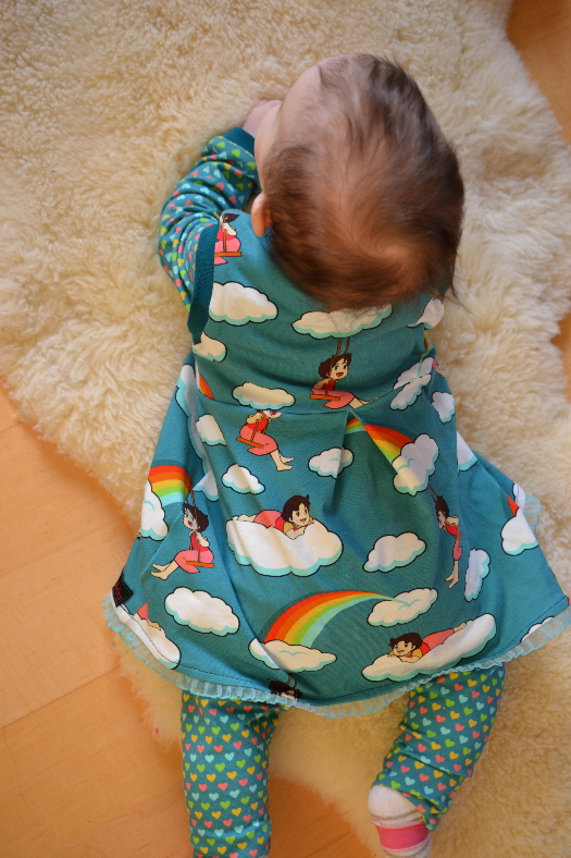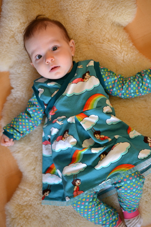 Meine Kleine Maus macht gerade wieder einen heftigen Schub. Vor zwei Tagen hat sie gelernt, sich von der Bauchlage auf die Rückenlage zu drehen. Seitdem schläft sie ganz schlecht und ist total aus dem Rhythmus gekommen. Ich bin ganz stolz, dass ich es trotzdem geschafft habe, dieses Outfit noch pünktlich fertig zu nähen.
