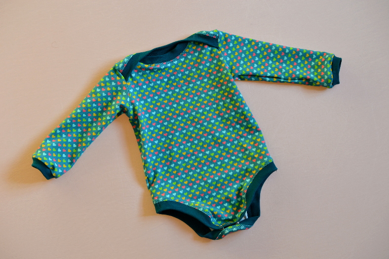 Schön ist auch der Kombistoff mit den Herzchen. Ich mag solche kleinmotivigen Stoffe gerne für Babykleidung.