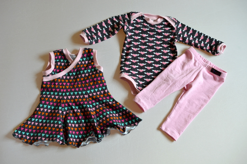 Im Moment nähe ich am liebsten ärmellose Kleider. Da kann man wunderbar einen langen Body drunter anziehen und jetzt wo es wärmer ist reicht es meiner Maus auch. Zumindest wenn ich noch eine Strumpfhose unter die Leggins quetsche.