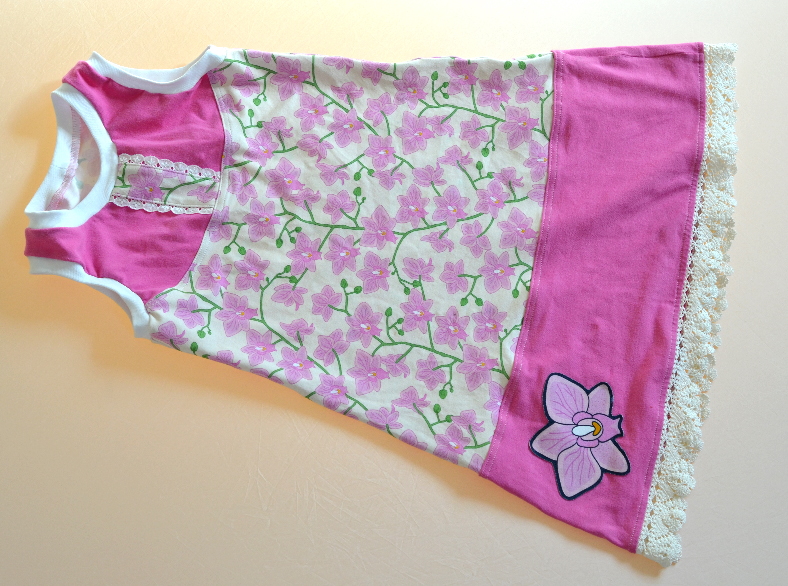 Der Schnitt ist wirklich gut geeignet, wenn man nur wenig Stoff hat. Meine Prinzessin zieht eigentlich am liebsten Drehkleider an. Als kleiner Trost, weil das Kleid eher eng geschnitten ist, habe ich ihr unten noch eine schöne Spitze angenäht. Von dem blauen Orchideenstoff habe ich sogar noch etwas übrig, d. h. ich kann ich sogar noch eine Volantjacke dazu nähen.