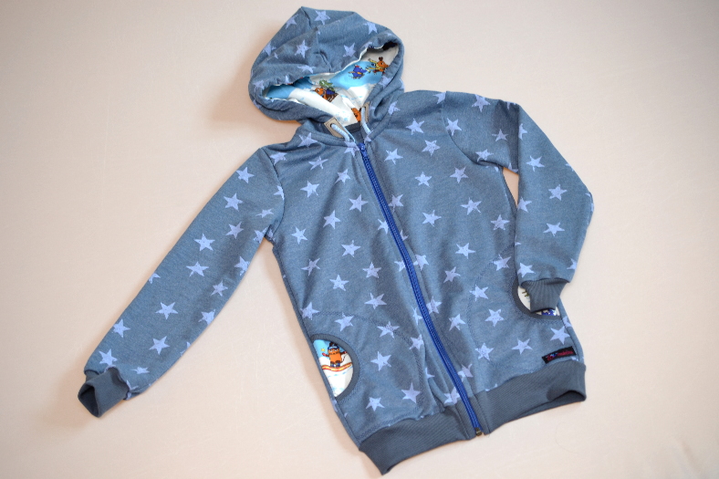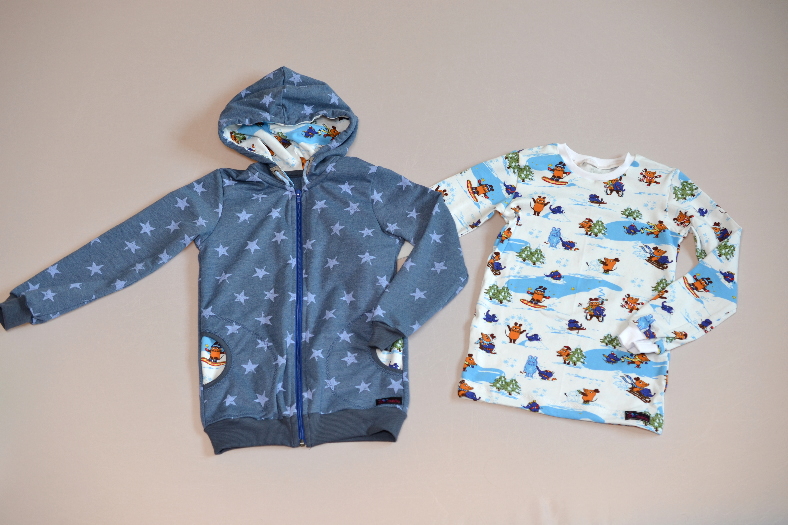 Für meine Große habe ich den wunderschönen Bordürenstoff verwendet. Die schönen Sternchen vom Body und Shirt sind leider schon ausverkauft! Es gibt sie aber noch in Baumwollwebware.