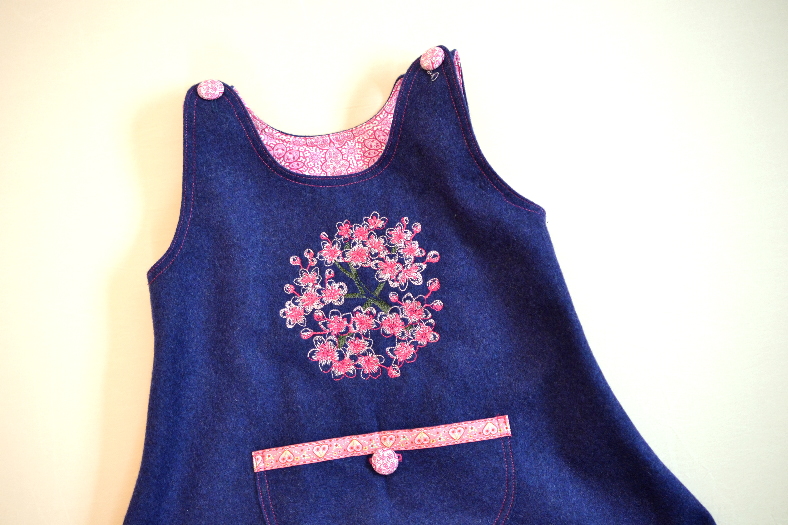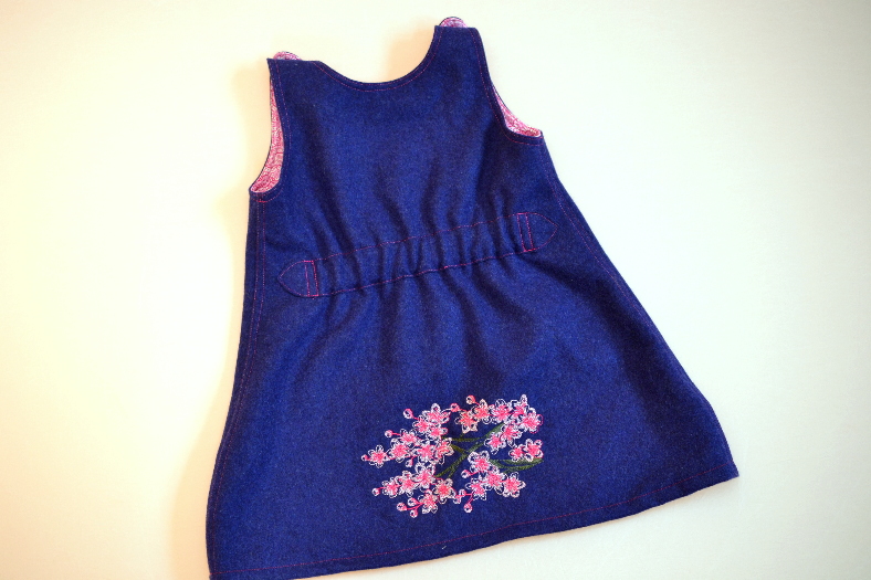 Als Schnitt habe ich etwas neues gebastelt – auf Basis von meiner Strampelina. Das Kleid ist aufwändig bestickt mit dieser Datei. Die Knöpfe habe ich selbst bezogen. Hinten ist das Kleid gerafft, dass sieht ganz süß aus bei einem Windelpopo.
