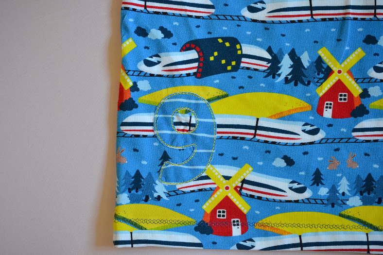 Das hier ist die kurzarm-Variante. Auch hier mit applizierter Zahl. Allerdings fällt sich auf dem Stoff fast gar nicht auf. Wenn ihr auch so Eisenbahnfanatiker zu Haus habt, müsst ihr Freitag früh aufstehen und bei Stoff&Liebe vorbei schauen!