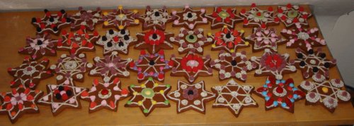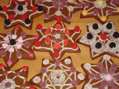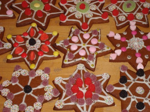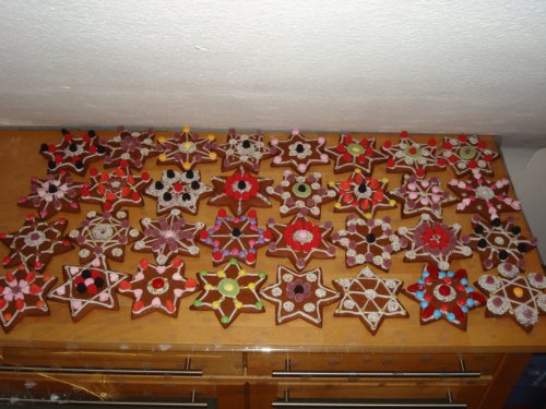 Ich habe mal wieder eine Großproduktion gestartet. Ich mache jedes Jahr für meine Schüler eine Kleinigkeit: Weihnachtsbäumchen aus Schokolade, Domino-Lokomotive, Schneemänner, Knusperhäuschen und dieses Jahr Lebkuchensterne. Das Rezept dazu habe ich schon mal letztes Jahr gepostet: weiche Lebkuchen. Ich finde sie wirklich lecker, sie müssen nur eine Woche liegen. Ich habe das Rezept mal drei genommen und 4kg Teig erhalten (hier noch mal vielen Dank an meine Kenwood, die hat gar nicht gemuckst).