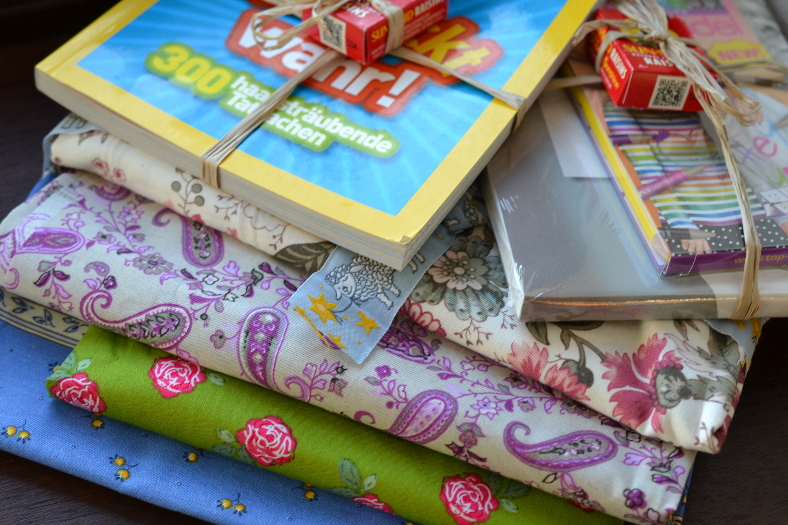 Das nächste Päckchen kam von Verena, mit schönen Stoffen und Spitze! Außerdem noch Nervennahrung für mich und die Kinder.