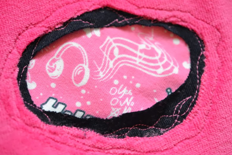 Dann habe ich in den Nicki so Gucklöcher geschnitten, dahinter noch einen dunkelblauen Jersey mit Sprühkleber geklebt und diesen ebenfalls etwas ausgeschnitten und dahinter dann ein Stückchen vom Jersey mit Motiv gesteckt. Das ganze dann einfach mit der Nähmaschine frei Hand (mit dem Stopffuß, versenktem Transporteur und etwas reduzierter Fadenspannung) etwas schlampig fest genäht.