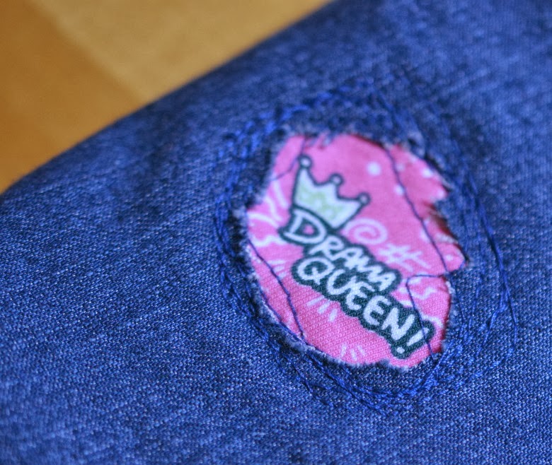 Die Gucklöcher dürfen natürlich nicht fehlen. Es hat mich große Überwindung gekostet ein Loch in die halbfertige Jeans zu schneiden, aber das Ergebnis hat mich dann doch überzeugt. Ich habe hinter den Jersey noch eine Lage Jeans gelegt, damit es stabil bleibt.