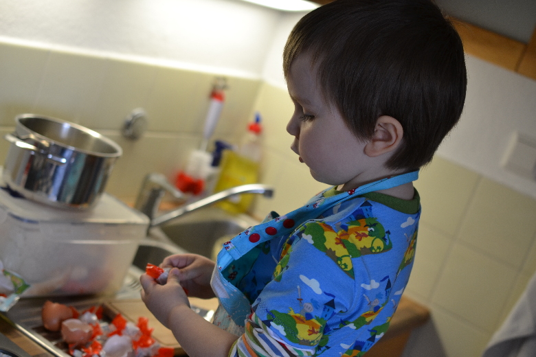 Danach haben wir Geburtstagsmuffins gebacken. Mit Schoko-Bons-Füllung!
