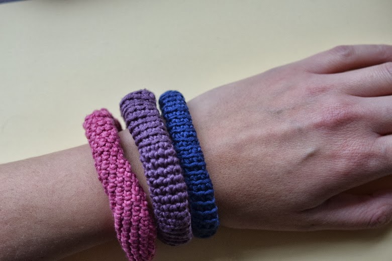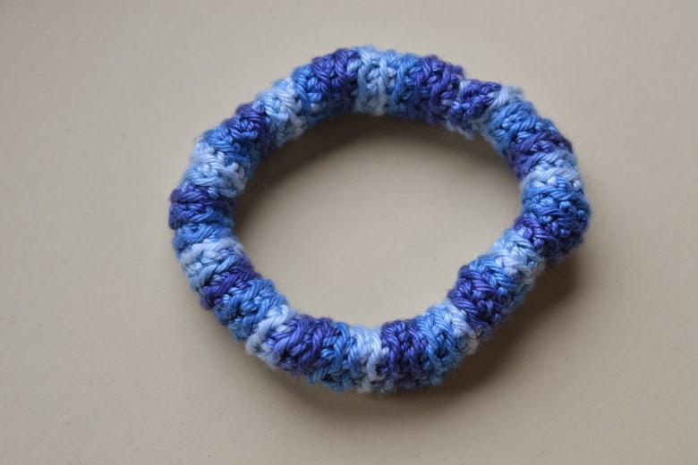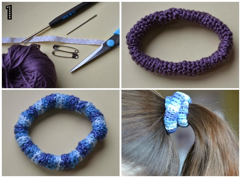 Wir haben früher für unseren langen Haare Haargummis direkt aus dünnem Gummiband gehäkelt, in rosa und hellblau 🙂