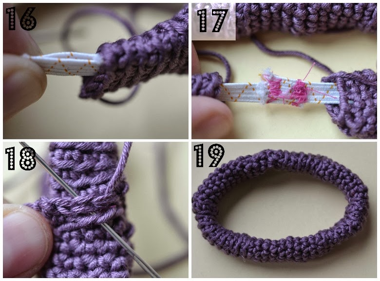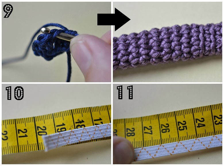 12. den gehäkelten Schlauch genauso lang machen, wie das gedehnte Gummiband. Den Restfaden abschneiden und durch die Schlaufe ziehen.