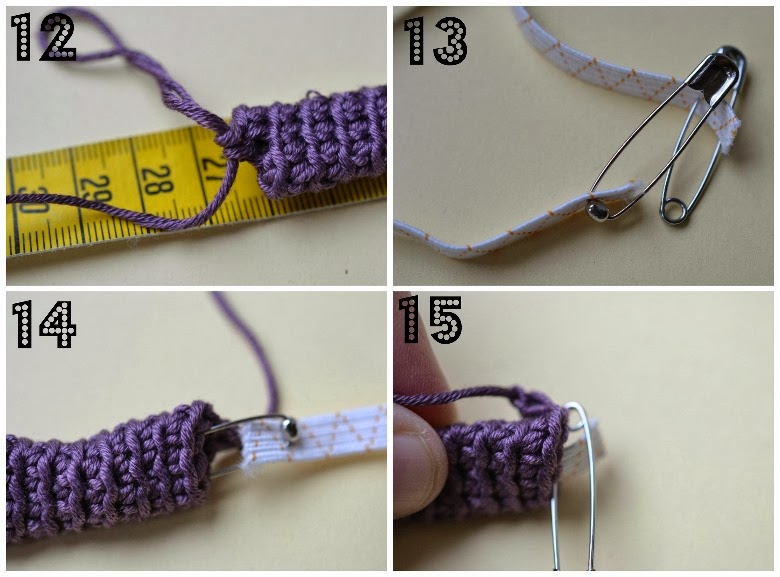 14. Das Gummiband durch den gehäkelten Schlauch fädeln.