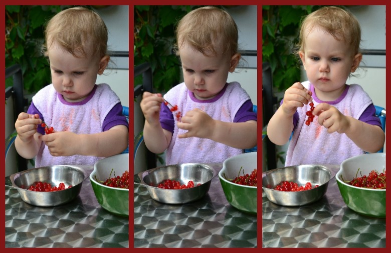 Die Prinzessin hat dann hochkonzentriert die Beeren abgestreift. Sie hat ein 5-Minutenlätzchen als Schürzenersatz an.