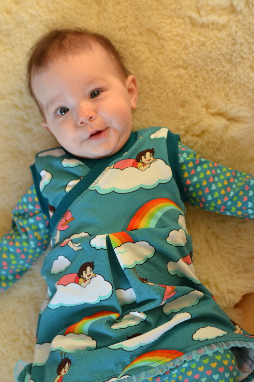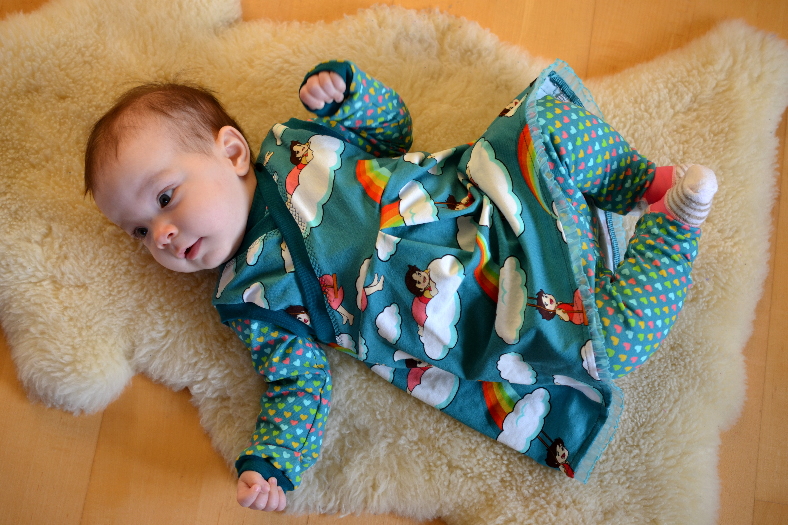 Meine Kleine Maus macht gerade wieder einen heftigen Schub. Vor zwei Tagen hat sie gelernt, sich von der Bauchlage auf die Rückenlage zu drehen. Seitdem schläft sie ganz schlecht und ist total aus dem Rhythmus gekommen. Ich bin ganz stolz, dass ich es trotzdem geschafft habe, dieses Outfit noch pünktlich fertig zu nähen.