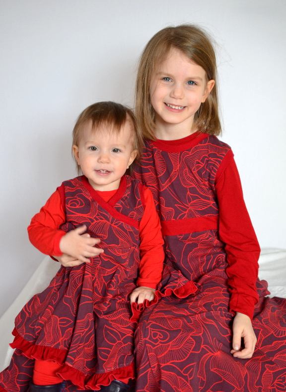 Für meine kleine Tochter habe ich auch ein Drehkleid genäht. Der Stoff hat gerade so gereicht, vor allem weil ich z. T. die Rosen auf dem Kopf vernäht habe. Zum Glück sieht man das bei diesem großen Muster nicht wirklich.