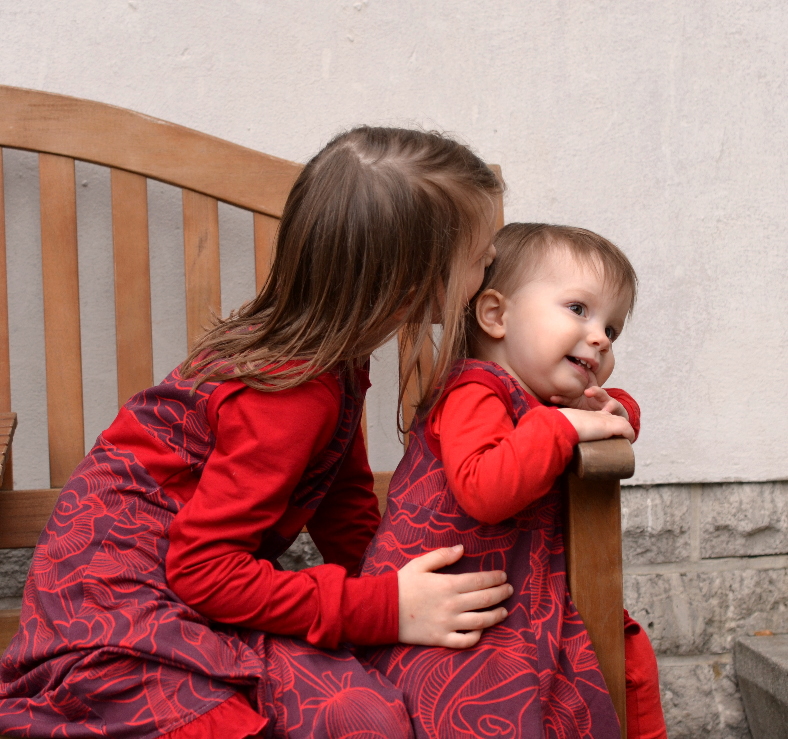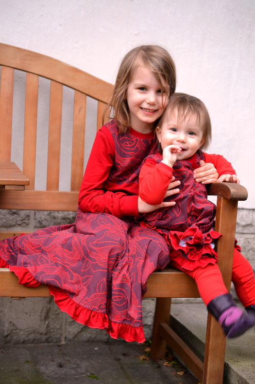 Genäht habe ich ein etwas verlängertes Kapuzenkleidchen mit einer ordentlichen Rüsche unten dran. Darunter gab es für beide eine Leggins und ein Shirt, bzw. Regenbogenbody. Der vom Engelchen ist noch in Größe 74 – da muss ich noch einmal einen in Größe 80 nähen – das Kleid passt sicher noch eine ganze Weile.