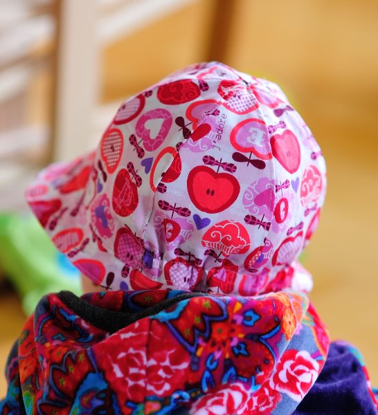 Das ist ja wie Gedankenlesen 🙂 Genau nach so einem Hutschnitt hab ich gestern gesucht. Dann warten ich doch jetzt auf deinen Schnitt 🙂 Die Version, nur vorne Schirm finde ich auch total süß. Deine Maus sollte auf jeden Fall eine menge solcher Hütchen haben, sie sieht so niedlich damit aus.