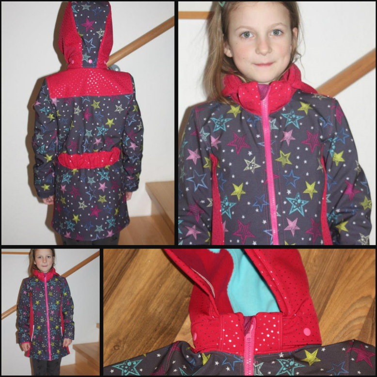 Diese Jacke ist eigentlich für Softshell gedacht. Du kannst sie aber auch aus einem anderen, nicht dehnbaren Jackenstoff nähen. So eignet sich z. B. Jeans oder Cord auch sehr gut für diesen Schnitt. Zusätzlich zum Softshell brauchst Du noch einen dünnen, wasserabweisenden Jackenstoff. Der verhindert, dass die Jacke an vielen Stellen zu dick wird. Wenn Du die Jacke aus Jeans oder Cord nähst, kannst Du statt des Jackenstoffes einen normalen, gewebten Baumwollstoff nehmen.