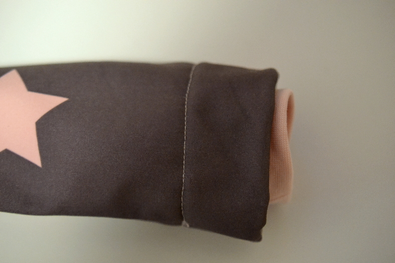 Die Jacke hat versteckte Ärmelbündchen. Möchtest Du die Jacke ohne diese Nähen, musst Du die Ärmel etwas kürzen. Die kürzere Linie am Ärmel entspricht der notwendigen Ärmellänge.