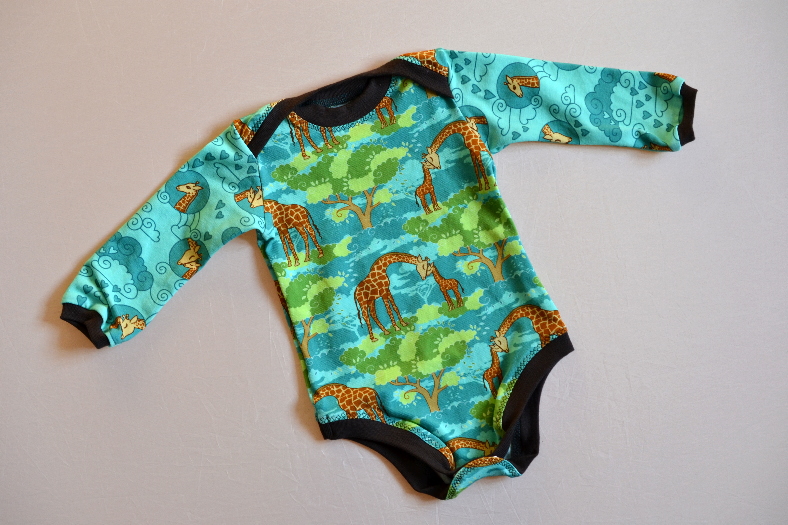Als ich den Stoff Giraffenliebe in der Hand hielt musste ich sofort an das Babyset denken, dass ich vor zwei Jahren für meine Freundin genäht habe. Damals habe ich auch eine Giraffe gestickt und verzweifelt einen Giraffenprint gesucht. Weil ich mit dem damals gewählten braunen Punkten nicht wirklich glücklich war musste ich jetzt einfach noch einmal so ein Set nähen – diesmal mit richtigem Giraffenprint.