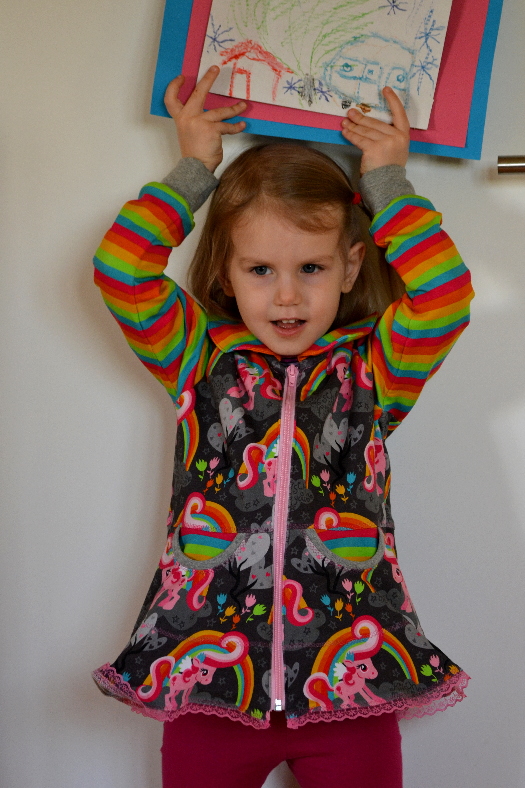 Ich wollte schon lange einen etwas mädchenhafteren Pulli/Jackenschnitt machen. Ich war sehr mutig und habe gleich beim ersten Versuch den wunderschönen Sweat angeschnitten. Das Jäckchen passt auch schon recht gut, nur der Halsausschnitt ist noch zu weit.