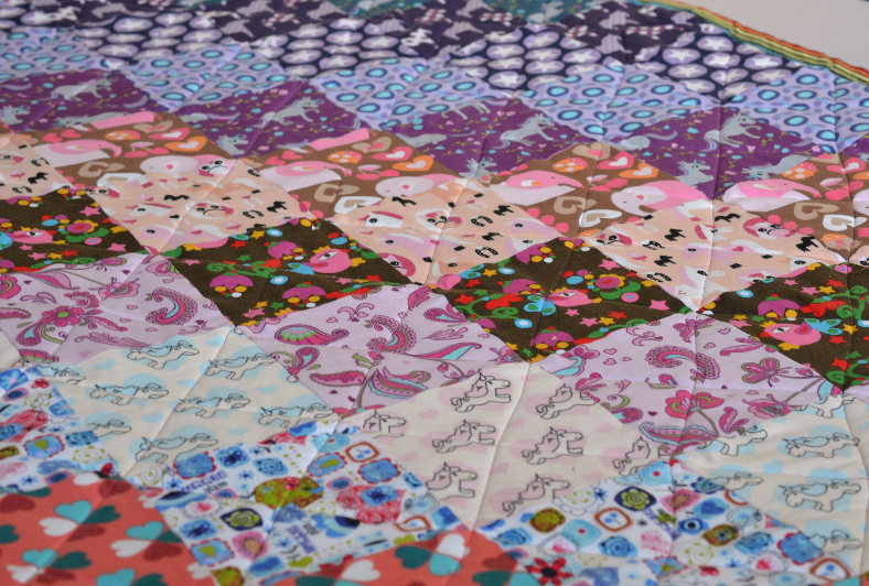 Als Rückseite habe ich Sweatshirt verwendet. Dadurch wird die Decke sehr kuschelig und dick. Das Quilten ging erstaunlich gut. Die Linien sind zwar nicht absolut gerade, aber es gab zumindest gar keine Falten.