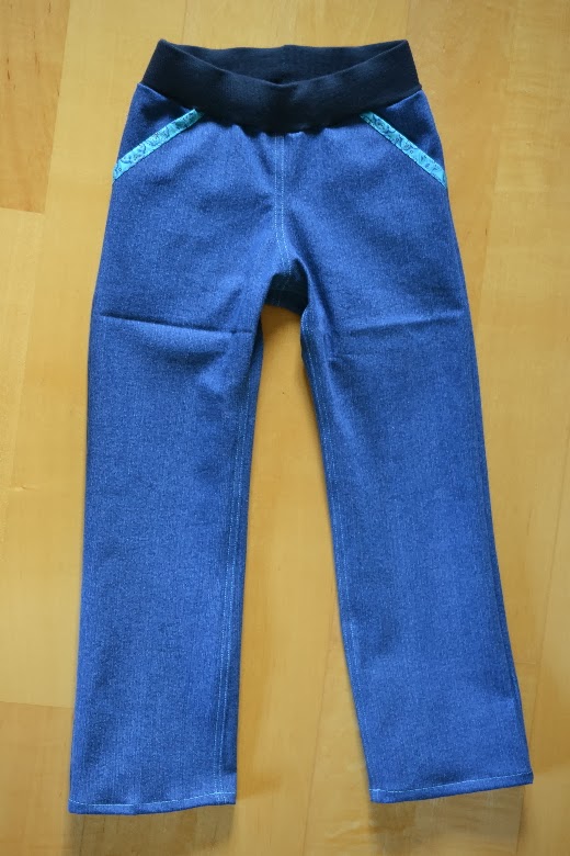 Mein Großer ist im Sommer ein ganzes Stück gewachsen und brauchte dringend wieder passende Hosen. Nachdem er immer noch über Knöpfe und Reißverschluss schimpft und die Hose lieber einfach so hoch und runter zieht, habe ich mir die Arbeit gespart und die Hose mit Bündchen und eingezogenem Gummiband genäht.