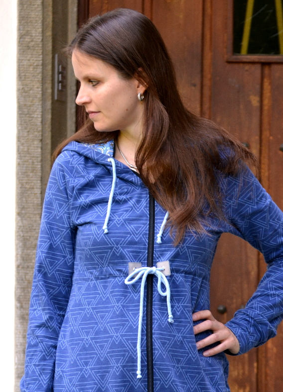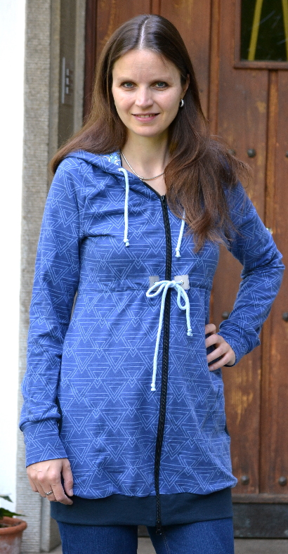 Ich mag am liebsten körpernahe Kleidung. Gerade Schwangerschaftsmode die sehr weit ist und sackartig an mir herunterhängt ist mir ein Gräuel. Allerdings braucht man doch Zuwachsmöglichkeiten. Also habe ich mich für eine Schnürung unter der Brust entschieden und den Longsweat bis unter die Brust sehr körpernah geschnitten.