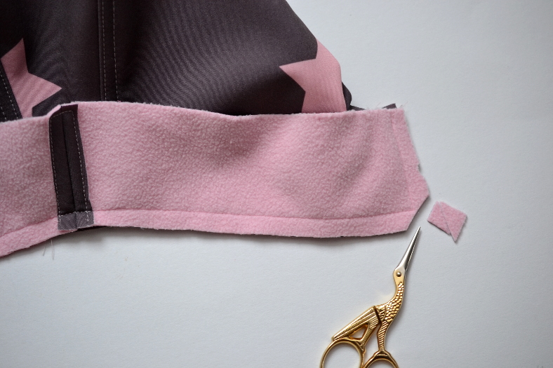 Jetzt kannst Du das überstehende Gummi und den überstehenden Kapuzenstreifen auf beiden Seiten kürzen.