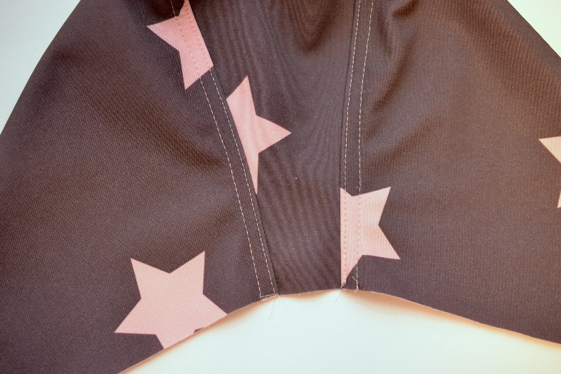 Genau so wird auch die andere Kapuze an die andere Stegseite gesteckt und ebenfalls mit Geradestich genäht.