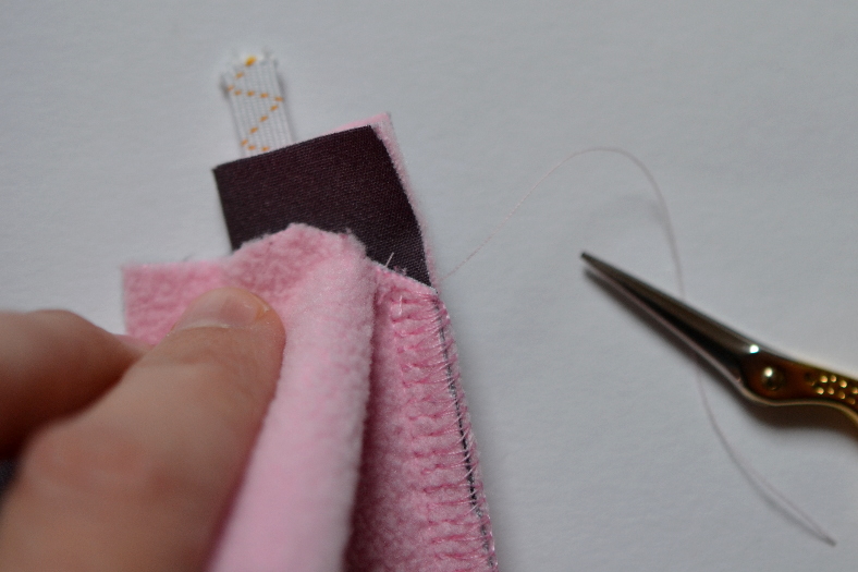 Ziehe jetzt mit einer Sicherheitsnadel ein 7mm schmales Gummiband durch den Kapuzenstreifen.