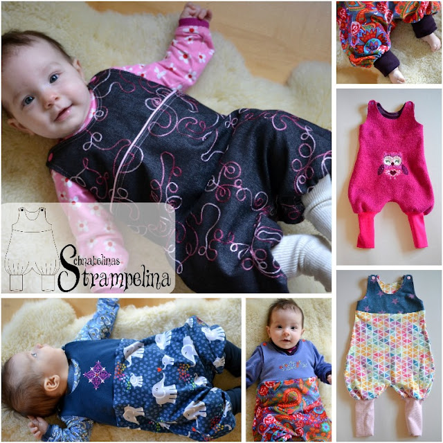 Für kleine Babys gibt es nichts praktischeres als Einteiler. Strampelina ist ein süßer Stramplerschnitt mit extra langen Beinbündchen, die toll mitwachsen. Er ist am Po besonders weit geschnitten und bietet auch einer Stoffwindel gut Platz. Oben wird er mit zwei Druckknöpfen geschlossen. Er kann aus Jersey, Sweat oder auch Webware genäht werden. Der Schnitt kann in allen Größen (43-92) aus nur 50 cm Stoff genäht werden.
