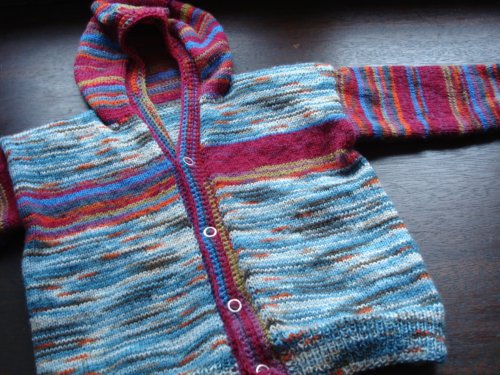 Ich stricke ja fast nur Socken. Die kann ich inzwischen blind stricken. Das ist wichtig, weil wir ein Heimkino haben und ich fast nur abends beim Film schauen stricke. Für meinen Süßen habe ich mich aber doch mal an einen Pulli gewagt. Der ist sogar sehr schnell fertig geworden. So ein größeres Strickprojekt droht bei mir nämlich immer zum Ufo zu werden. Ich habe Sockenwolle verwendet, da ich die Farben mag und die Wolle so schön robust ist und sich toll waschen lässt. Die Kapuze ist leider etwas zu klein, sie war aber sowieso nur als Deko gedacht.
