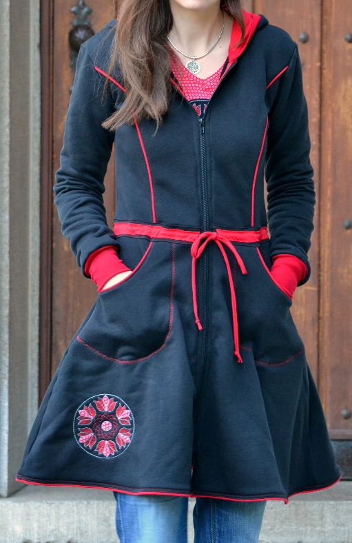 Das Kleid habe ich mit einem Mandala bestickt. Besonders mag ich die ganzen Paspelnähte.