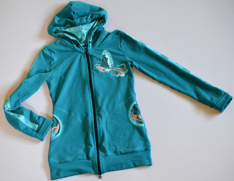 Als Deko für die Jacke habe ich für vorne und hinten jeweils einen Vogel ausgeschnitten und appliziert. Für vorne habe ich kräftig zum Strassapplikator gegriffen. Meine Tochter saß daneben und war sofort neidisch auf den schönen glitzernden Vogel.