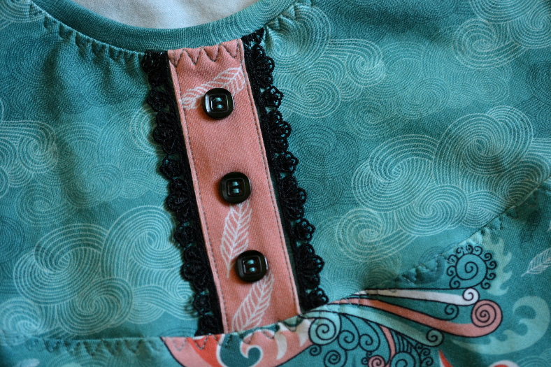 Ich habe die Webkante mal wieder für eine Knopfleiste genommen. Das gibt zusammen mit der schwarzen Spitze einen schönen Kontrast.